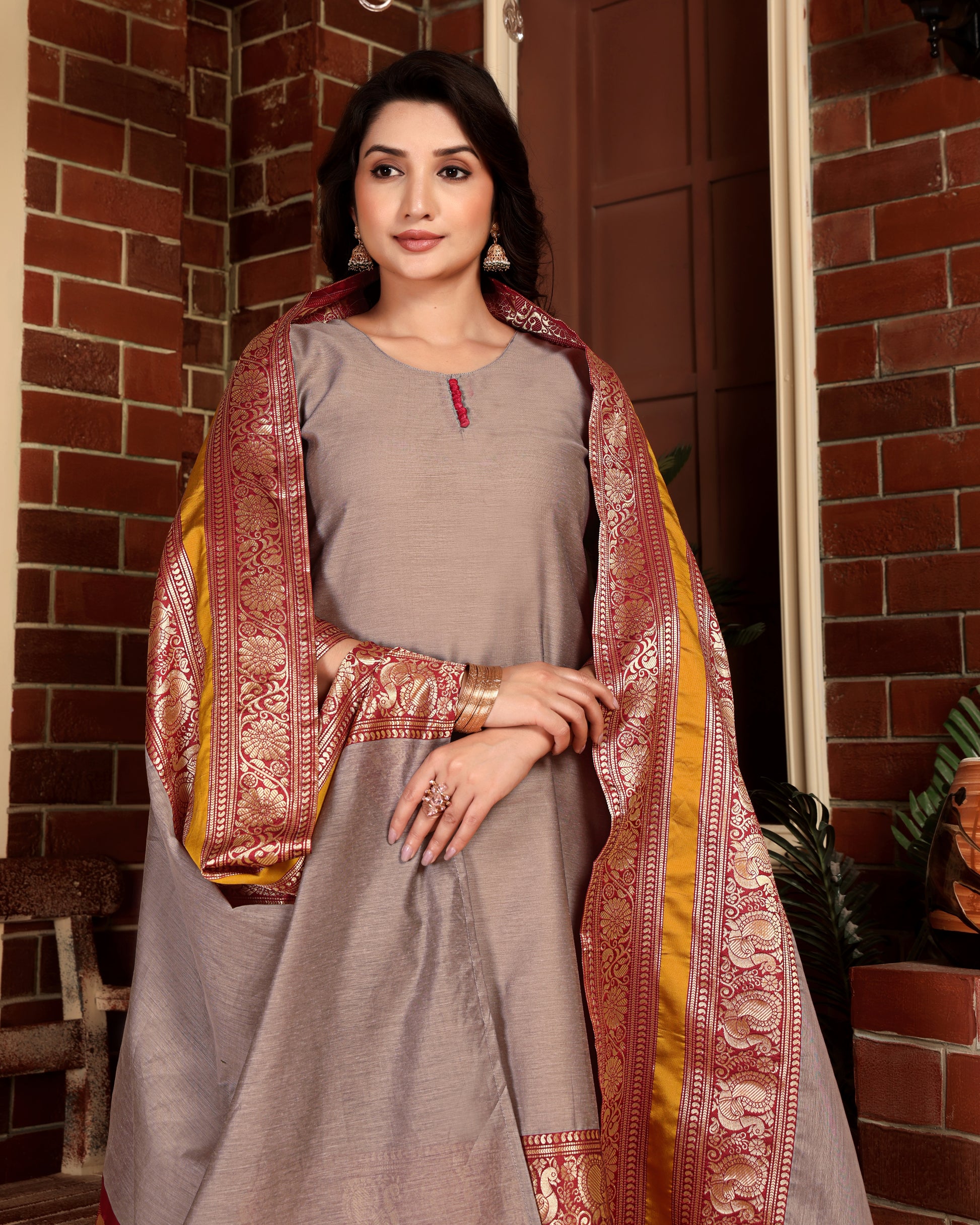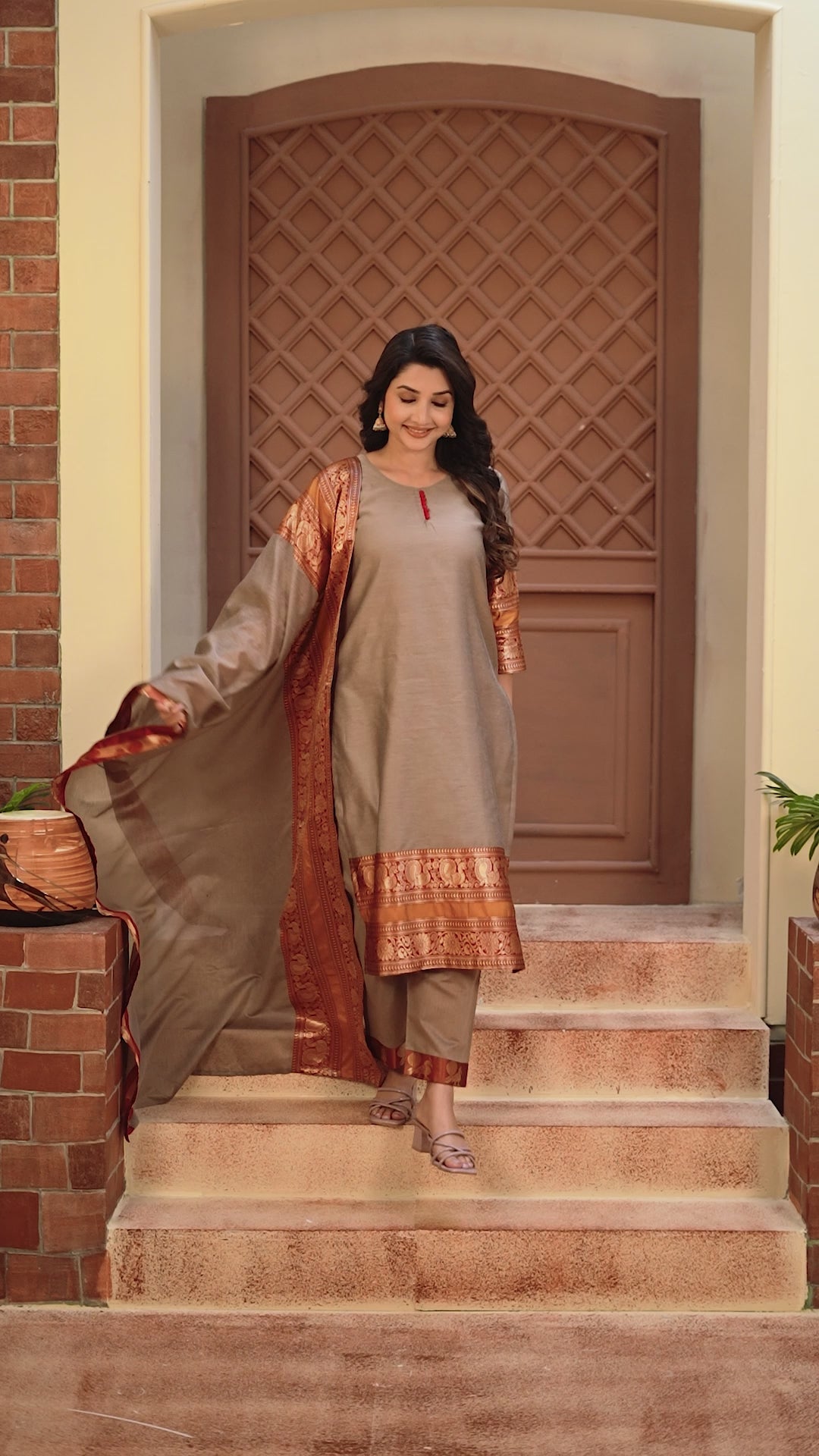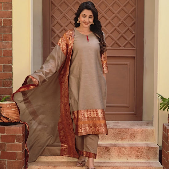 This ensemble includes a kurta, dupatta, and matching salwar, detailed with rich maroon and mustard zari borders that add a luxurious glow to the subtle beige tone.