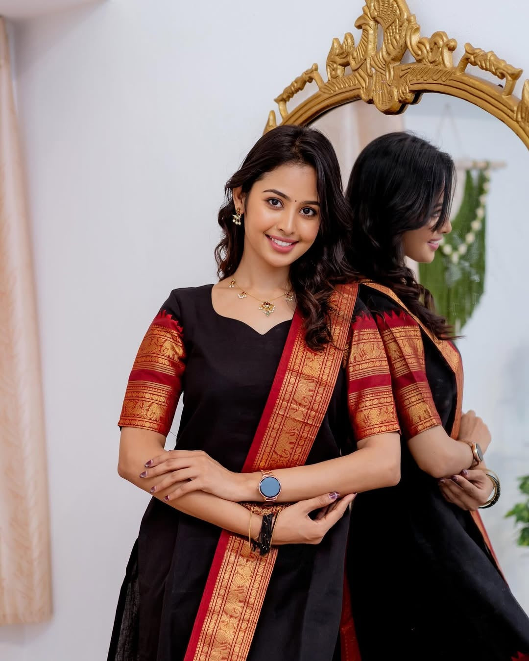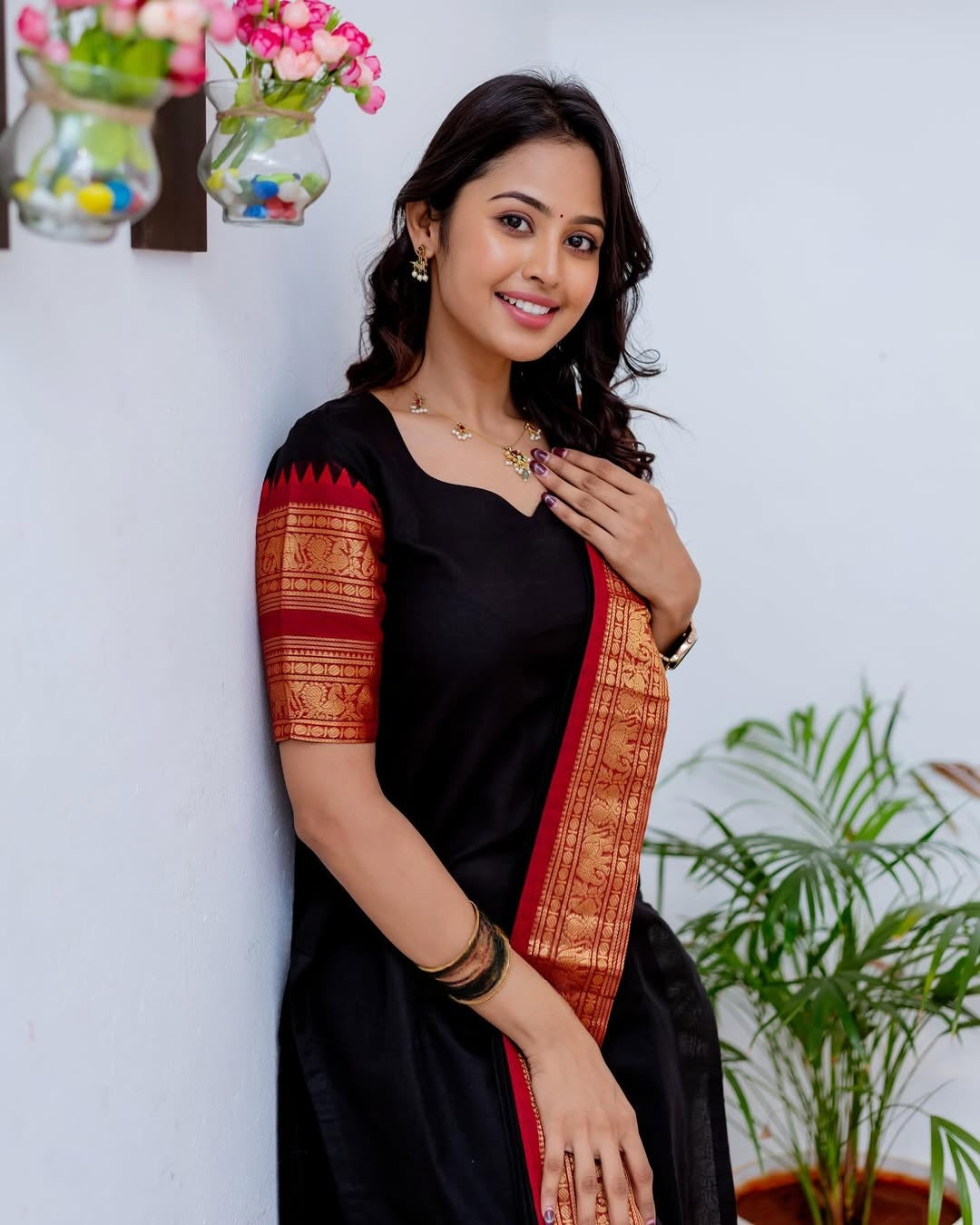 🖤 Color: Black with Red & Golden Zari Border