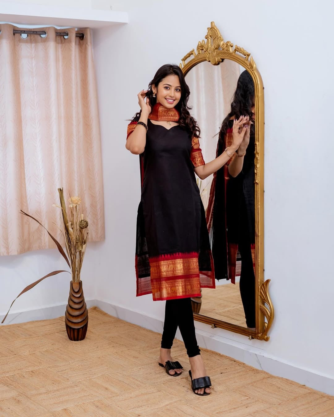 Mezos Black Cotton Silk Kurta with Red Golden Zari Dupatta – Elegant 2-Piece Set by Amali