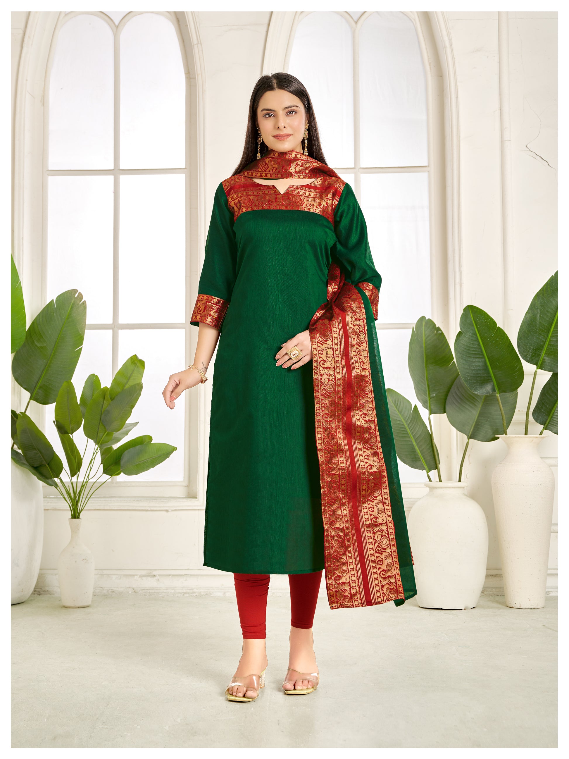 The Emerald Green & Maroon Suit Set by Amali brings together the richness of traditional weaving and the softness of cotton silk.