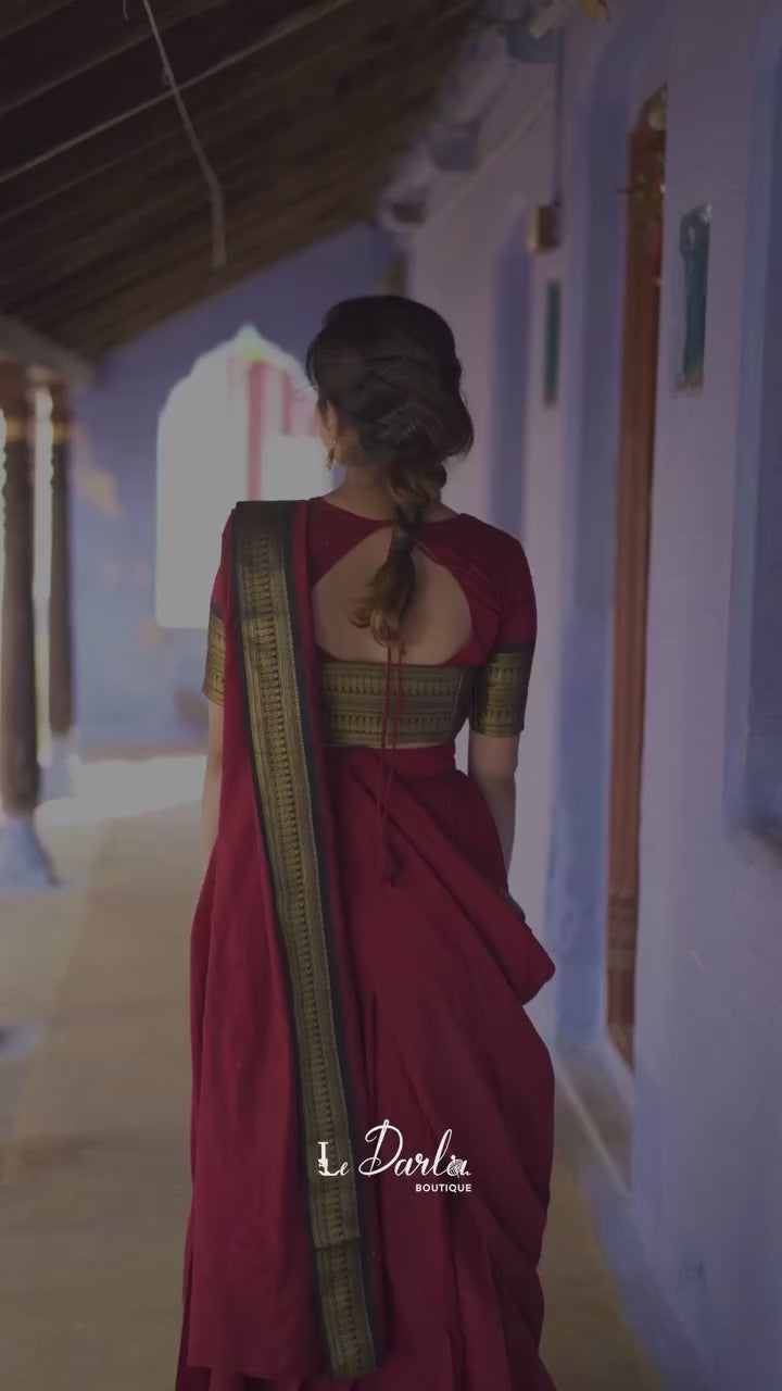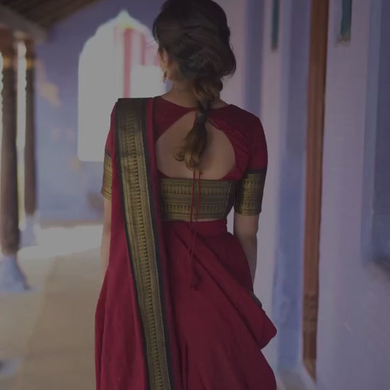 Introducing Amali’s Maroon Banarasi Silk Zari Half Saree Set — a tribute to timeless South Indian grace and royal elegance.
