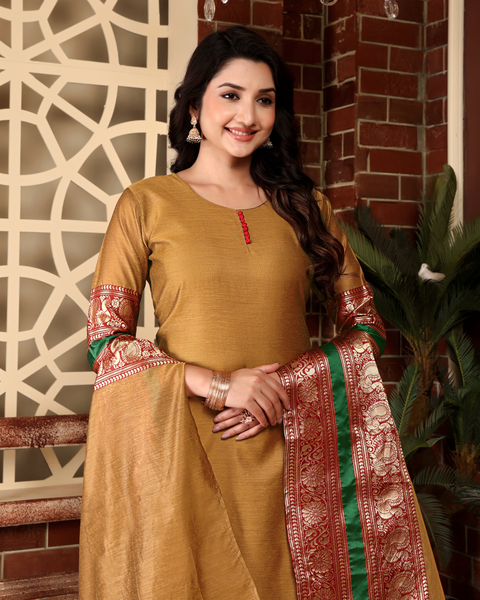 Crafted from premium cotton silk, this three-piece set features a kurta, dupatta, and matching salwar, all adorned with rich gold zari borders and hints of green weaving for a royal festive look.