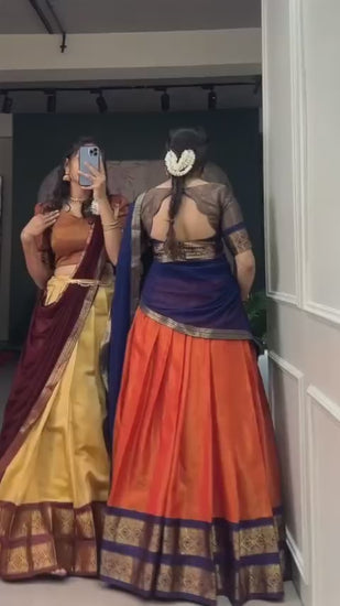 Bright, festive, and full of elegance — Amali’s Mustard Yellow & Bottle Green Banarasi Silk Half Saree Set captures the golden glow of tradition and the richness of timeless silk craftsmanship.
