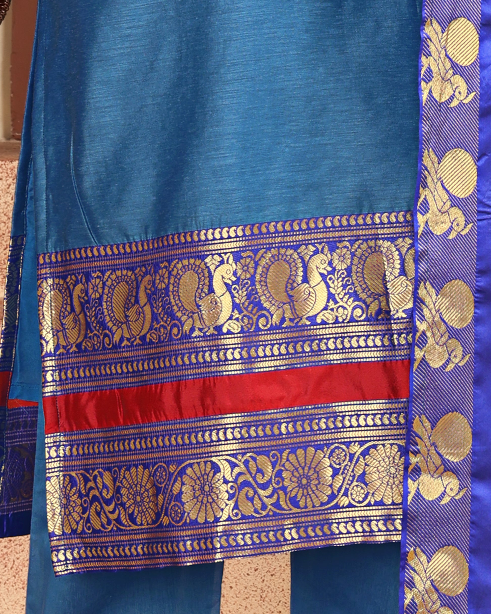 Mezos Sky Blue & Royal Blue Zari Border Cotton Silk Kurta with Dupatta and Salwar – Elegant Festive Wear by Amali