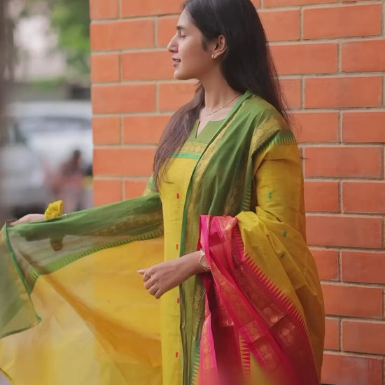 Made from premium cotton silk fabric, this 2-piece outfit features a vibrant yellow kurta paired with a dual-tone green and red dupatta enriched with elegant gold zari detailing.